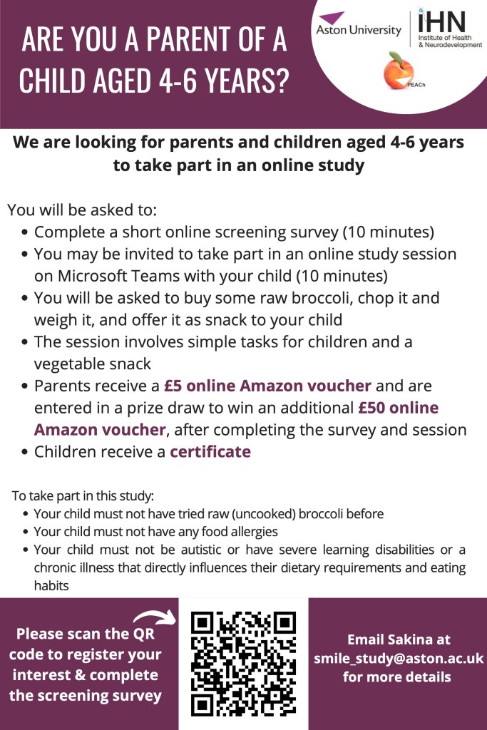 Plain English Summary: Are you a parent of a 4-6-year-old? Researchers from the SMILE study team are investigating strategies to increase young children’s consumption of vegetables. They need your help! You and your child may be invited to participate in a short, 10-minute online study session where your child will have the opportunity to try raw (uncooked) broccoli. After completing the survey and session, parents will receive a £5 Amazon voucher, and children will receive an online certificate. Additionally, parents will be entered into a prize draw for a £50 Amazon voucher. To learn more or register your interest, click here: https://astonpsychology.eu.qualtrics.com/jfe/form/SV_5hXmp2Hca9LRe2a. For any questions, contact Sakina Jafari from the SMILE study team.